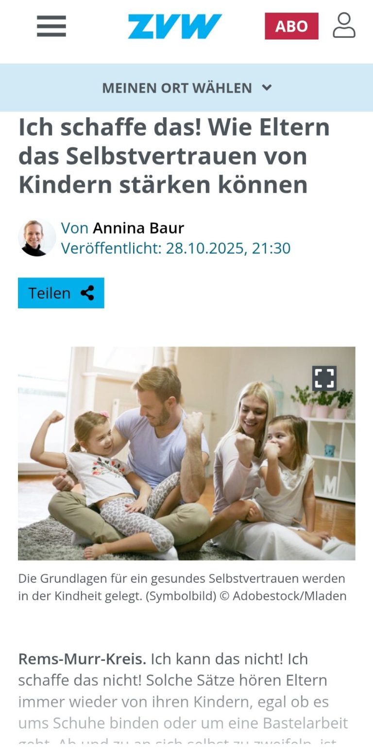 In einem kürzlich erschienenen Artikel in der Waiblinger Kreiszeitung von Annina Baur durfte ich darüber sprechen, wie Kinder ein gesundes Selbstvertrauen entwickeln können – und welche Rolle Eltern dabei spielen.